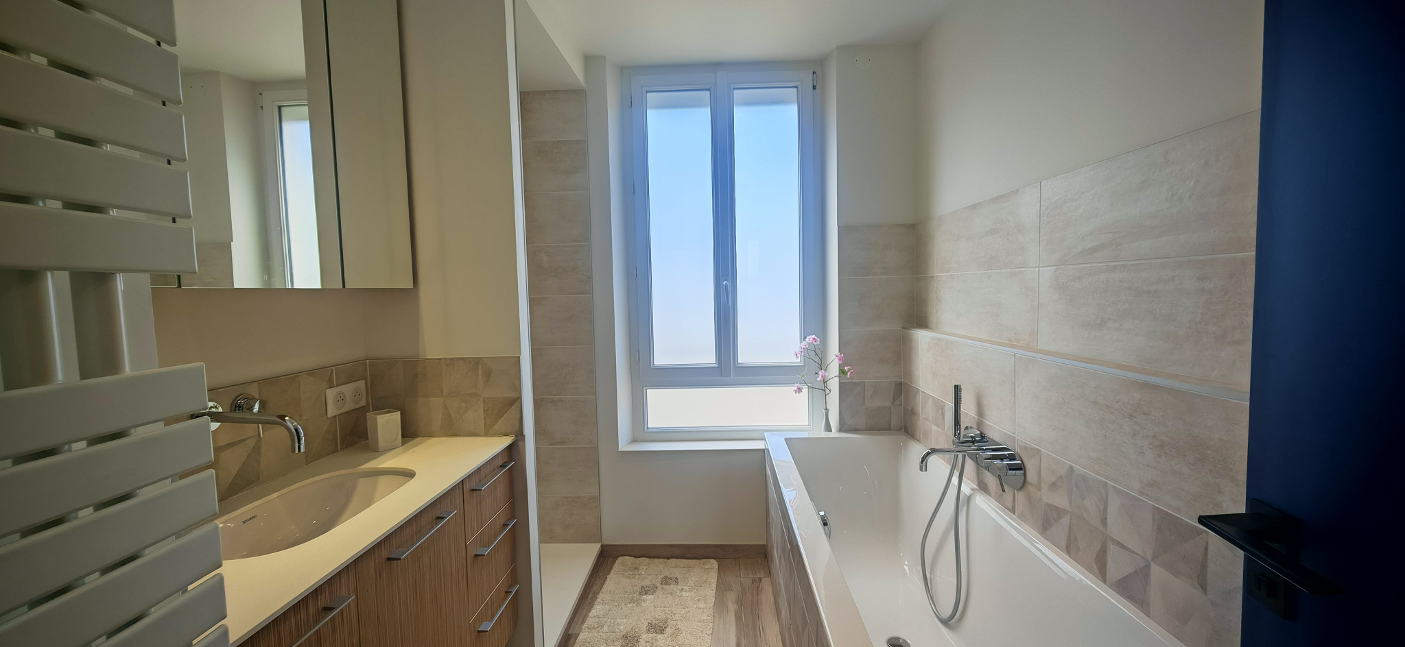 Cet appartement vous séduira dès l'entrée ou vous trouverez de grands placards de rangement intégrés; à droite la salle de bain ou vous pourrez vous relaxer soit dans la baignoire en vous prélassant dans un bon bain chaud , ou bien sous une interminable douche