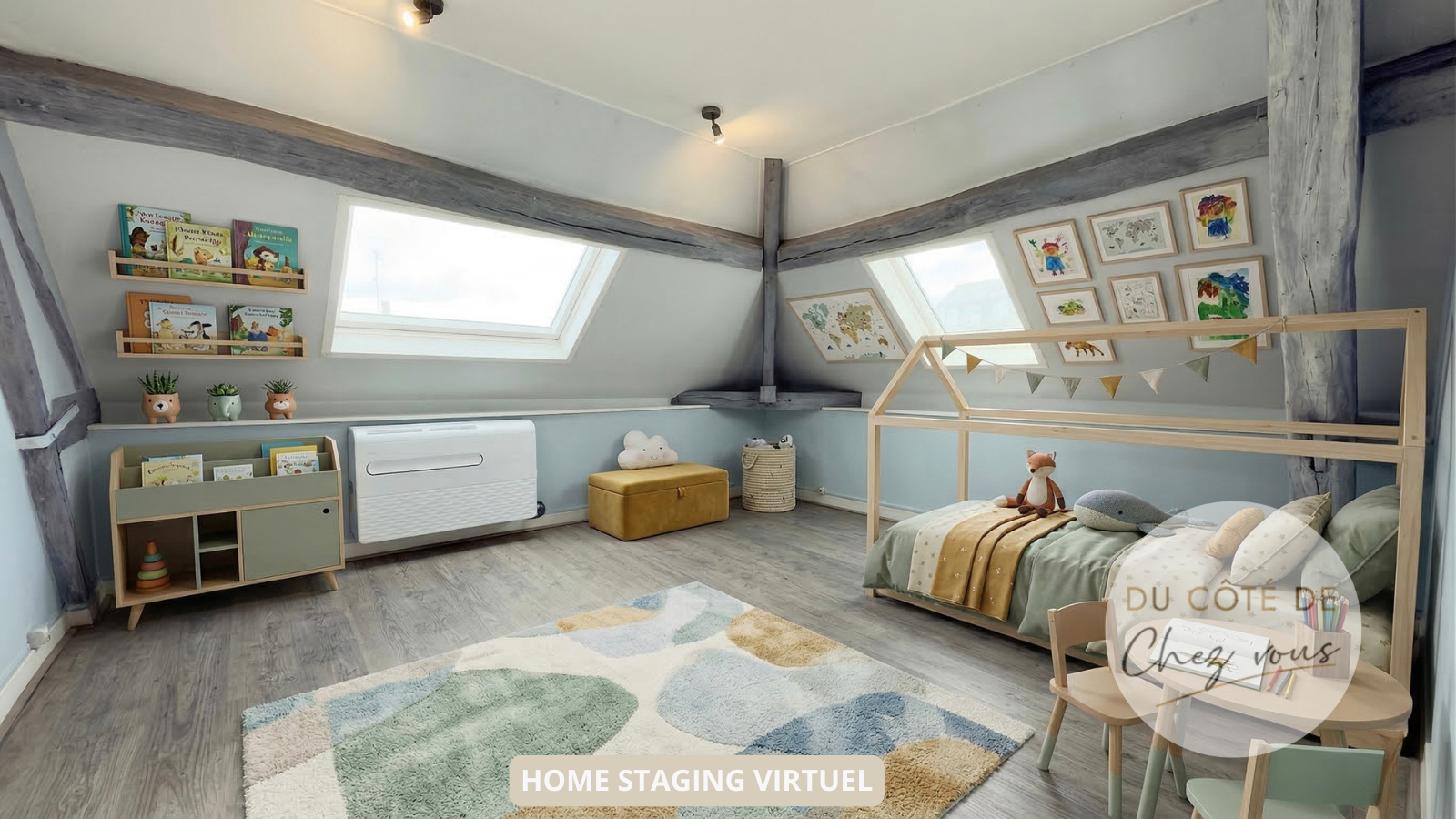 À l’étage, l’espace nuit offre deux très grandes chambres baignées de lumière, un bureau plein de charme, une salle de bains élégante et un second WC.