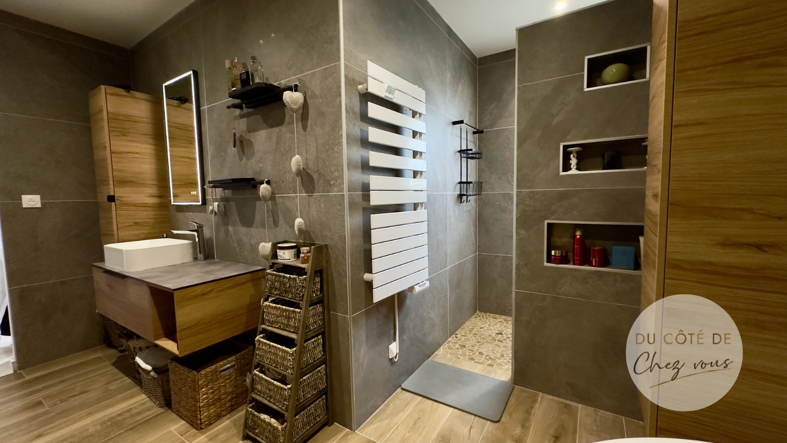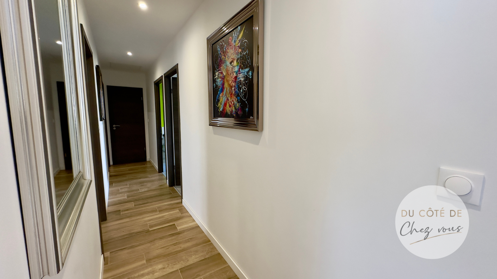 L'espace nuit se compose de trois chambres confortables, chacune offrant un havre de paix personnel. Dont, une chambre parentale spacieuse avec son propre dressing privé ajoute une touche de luxe à cette résidence. La salle de bains est un véritable sanctuaire de bien-être, équipée d'une douche à l'italienne et d'une élégante baignoire, offrant un espace de détente ultime.