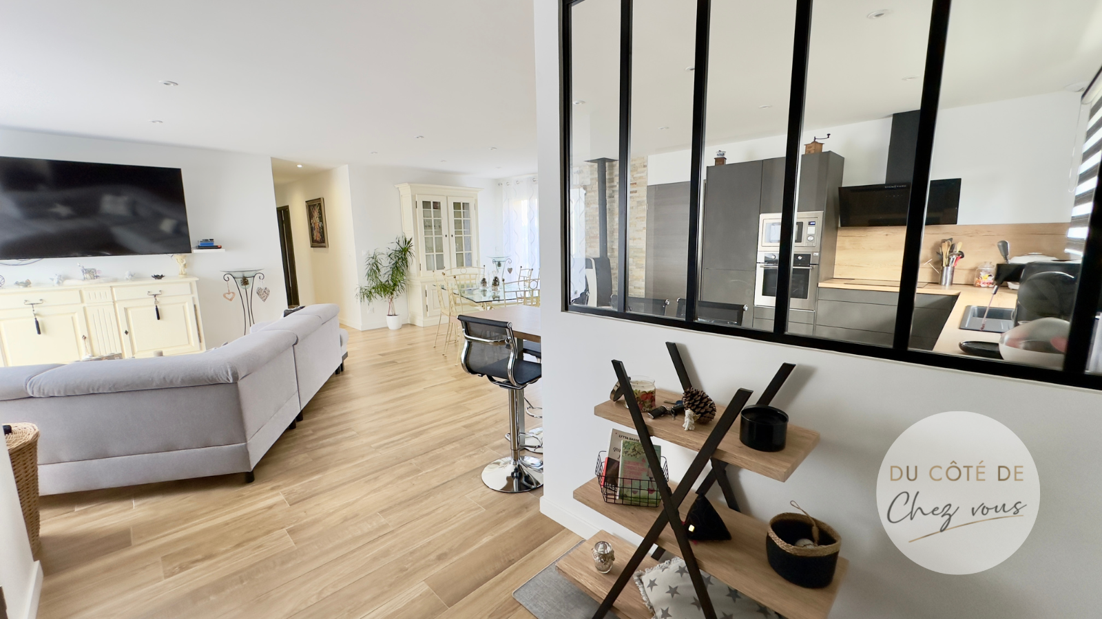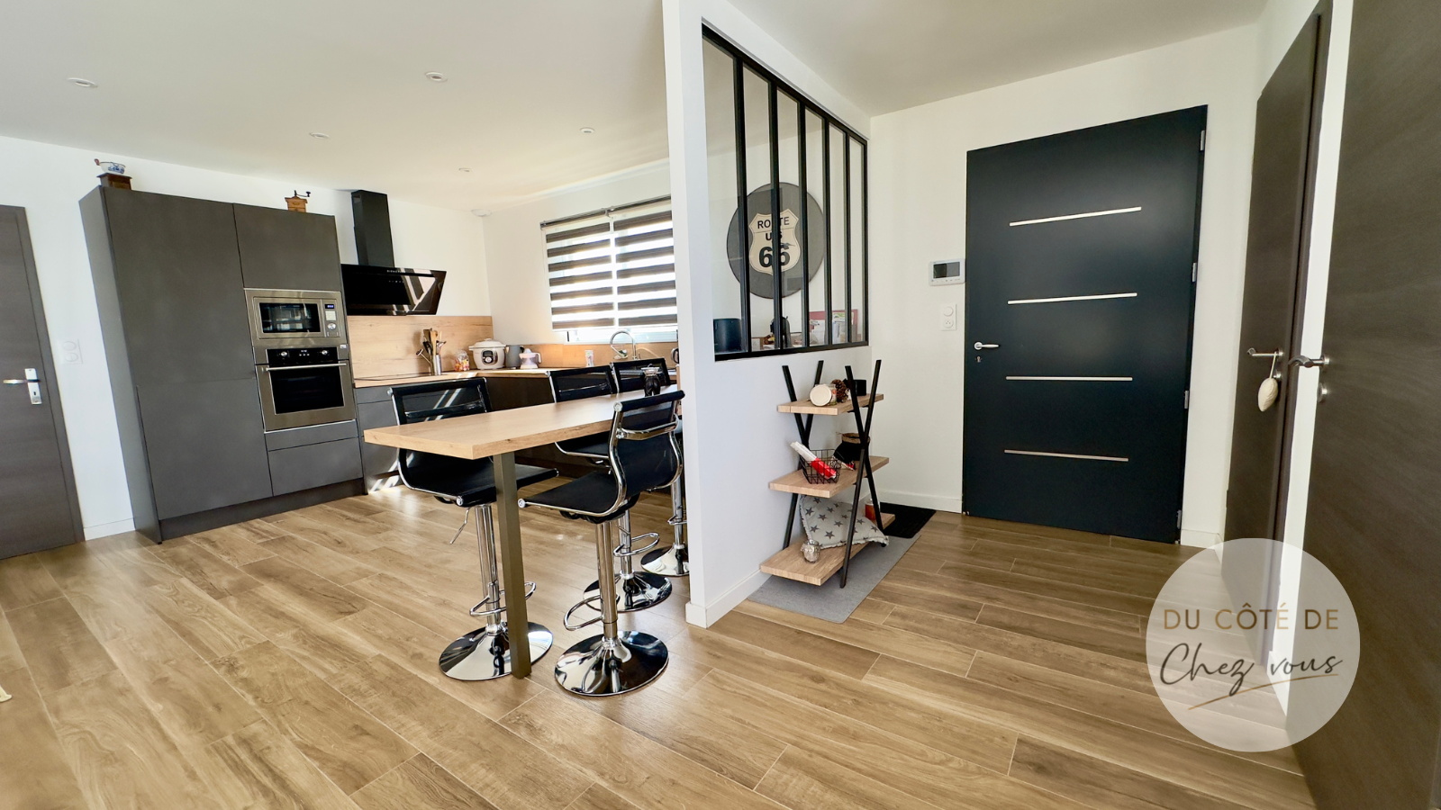 Dès votre arrivée, vous serez accueilli par une entrée spacieuse avec un élégant vestiaire, créant une première impression mémorable. Le salon-séjour, baigné de lumière naturelle, s'ouvre sur une cuisine ouverte aménagée et équipée de qualité, invitant à de délicieux moments de partage en famille ou entre amis. Un cellier-buanderie adjacent à la cuisine facilite la vie quotidienne en offrant un espace pratique pour vos besoins domestiques.