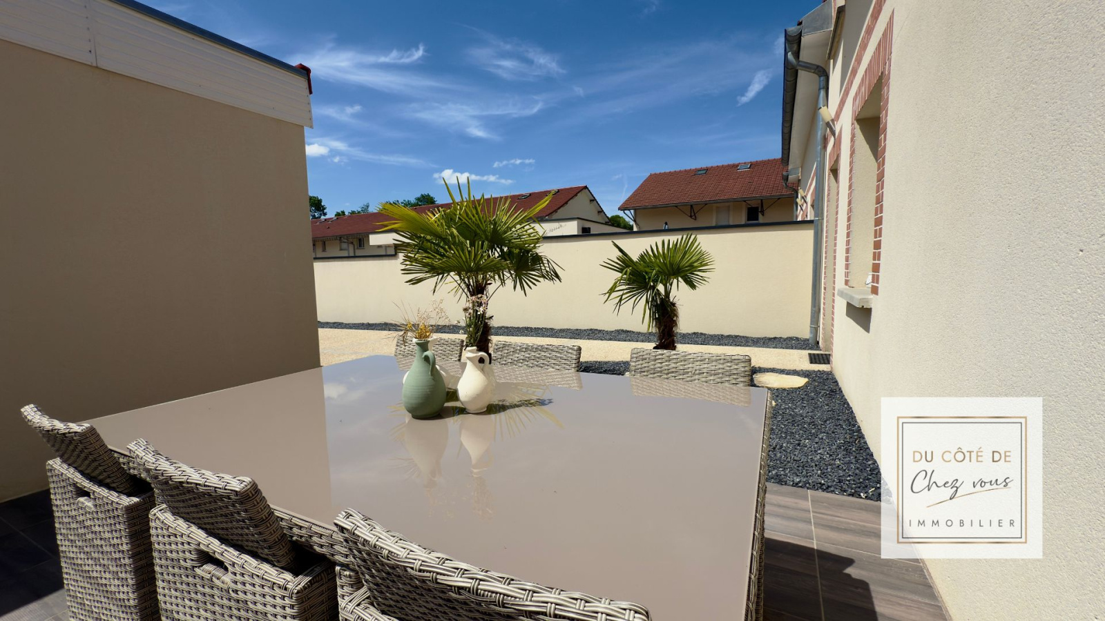 Ce terrain de 470 m2 est un véritable havre de paix : béton désactivé, palmiers, décorations florales, petit préau, dépendance... Rien n'est négligé.