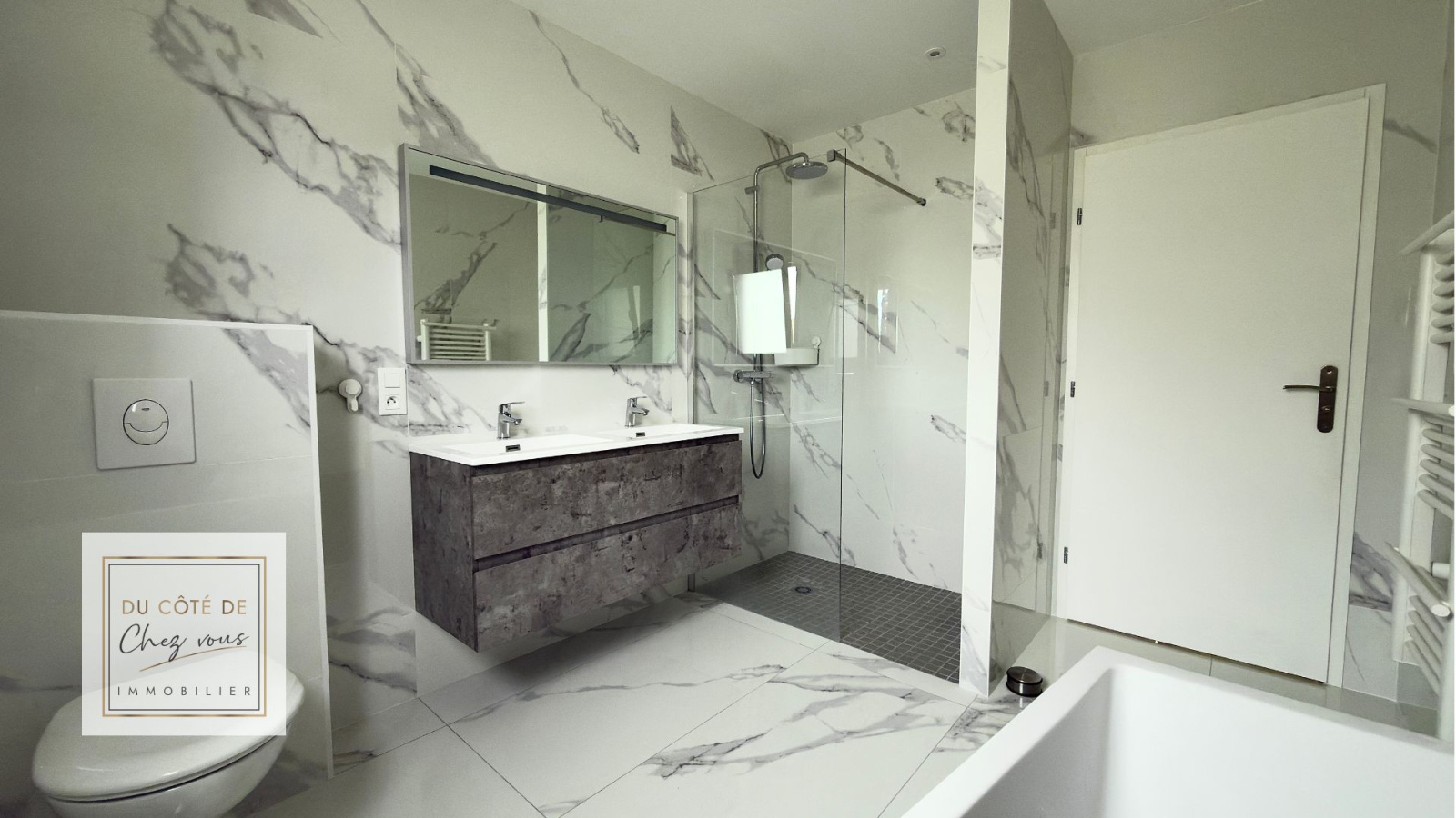 Côté nuit, quatre chambres spacieuses vous offrent de véritables espaces privés, toutes équipées de placards. La suite parentale séduit par son dressing et sa salle d’eau privative. Une salle de bains familiale, avec douche, baignoire et WC, ainsi qu’un second WC séparé, complètent l’ensemble.