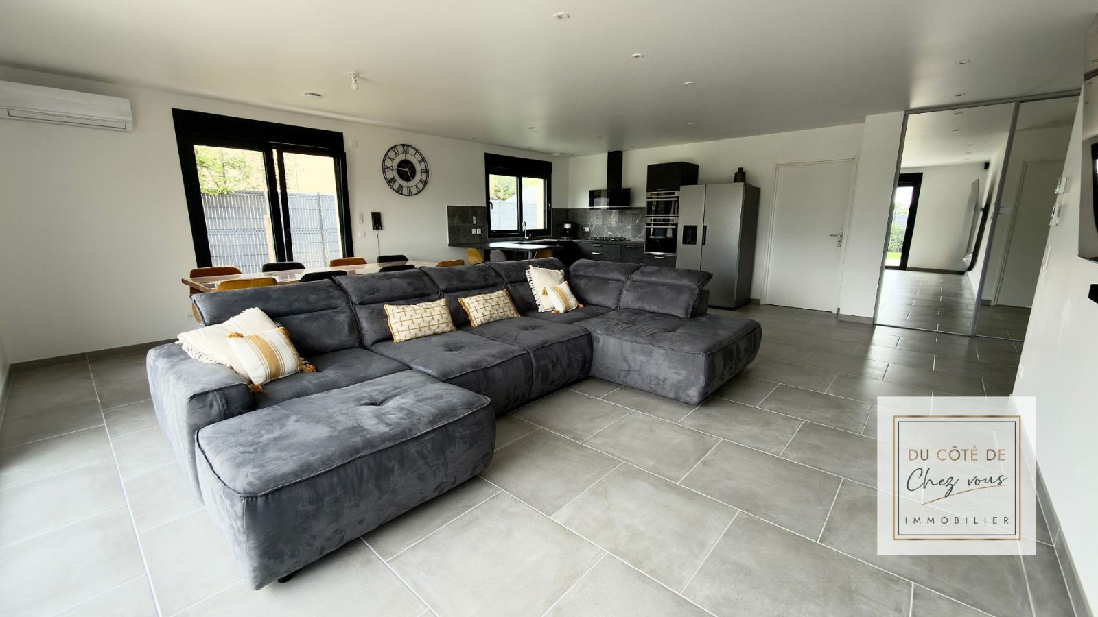 Édifiée en 2023, de plain-pied, elle développe 124 m² habitables et allie confort moderne, fonctionnalité et élégance. Dès l’entrée, le ton est donné : un hall spacieux avec rangement mène vers un vaste salon-séjour de 51 m², où la cuisine aménagée et équipée s’ouvre naturellement sur la pièce de vie. Les deux grandes baies vitrées, dont une de 3 mètres, prolongent l’espace vers le jardin et baignent l’ensemble de lumière.