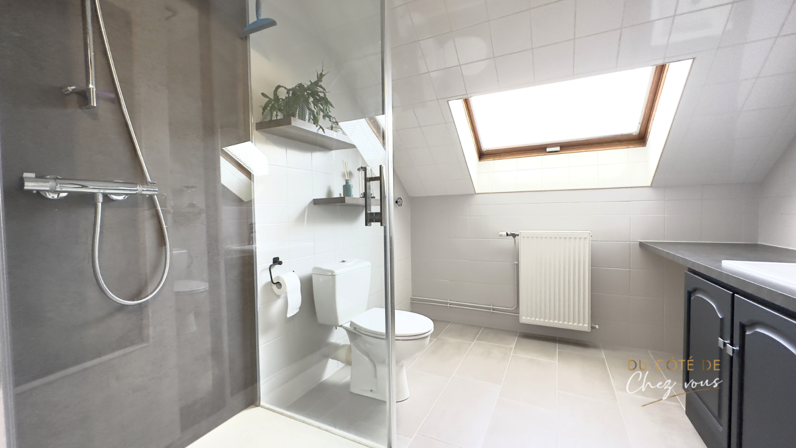 L'entrée accueillante donne sur un séjour spacieux avec une sublime cheminée, idéal pour les soirées d'hiver. La cuisine ouverte, entièrement équipée, est un véritable atout pour les amateurs de cuisine. Au rez-de-chaussée, vous trouverez également deux chambres confortables, une buanderie pratique et une salle de bain moderne.
