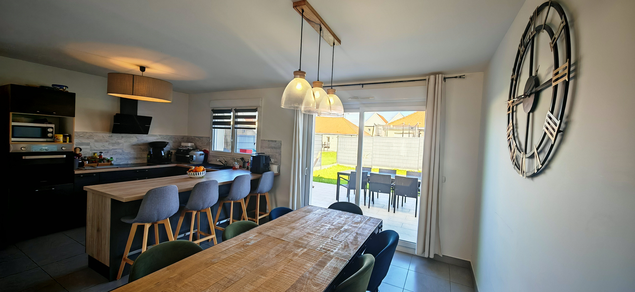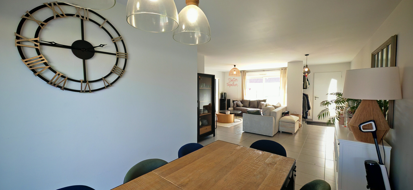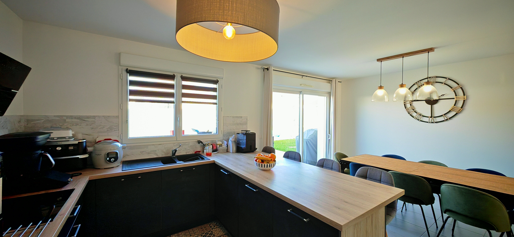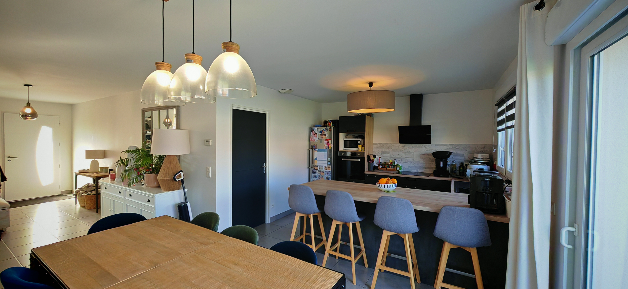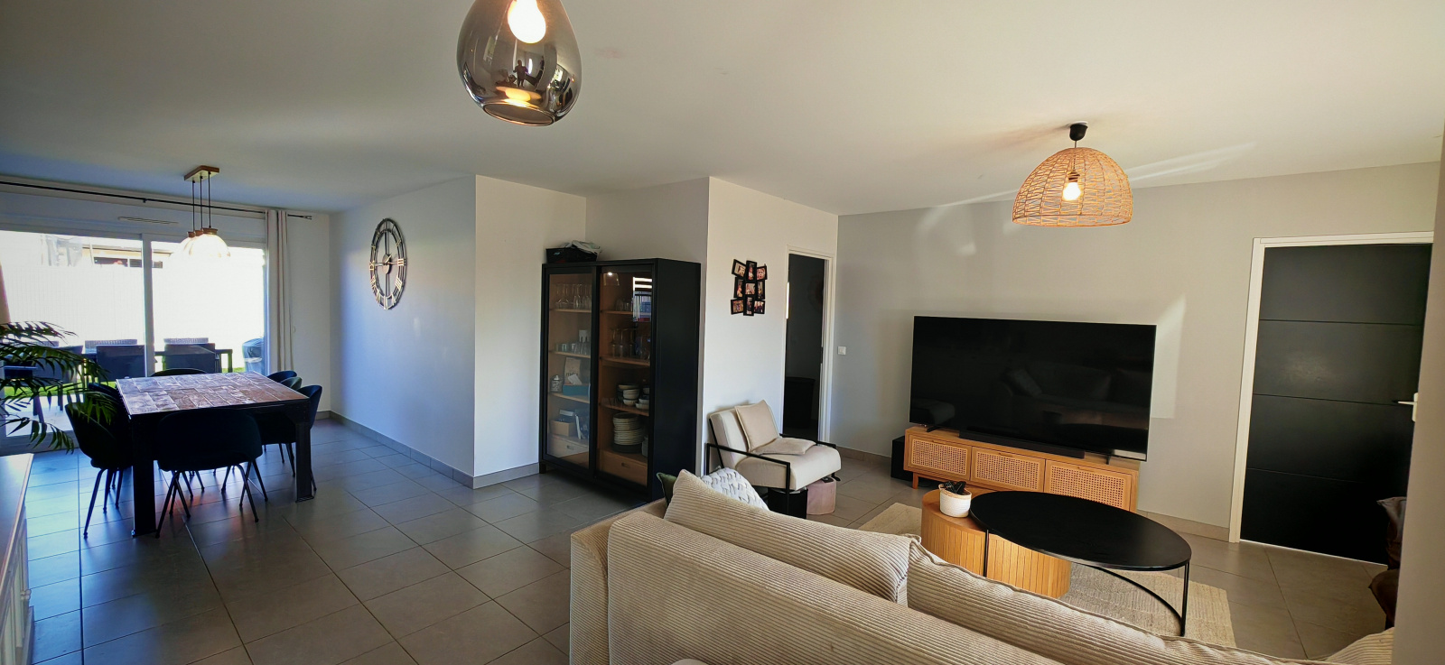 Dès l’entrée, la luminosité naturelle et les volumes généreux séduisent immédiatement. La pièce de vie, vaste et conviviale, comprend un salon-séjour avec cuisine ouverte, aménagée et équipée, donnant directement sur le jardin.