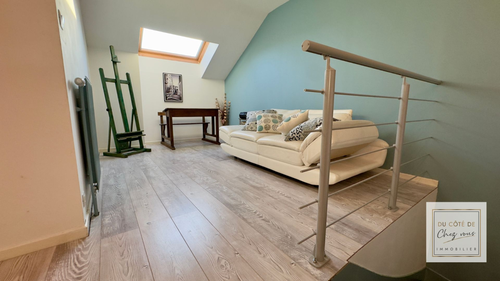 À l’étage, un grand palier, facilement transformable en espace bureau ou en chambre supplémentaire, mène à une seconde chambre spacieuse dotée d’un dressing et de sa propre salle d’eau privative . Deux petits greniers ajoutent encore davantage de possibilités de rangement.
