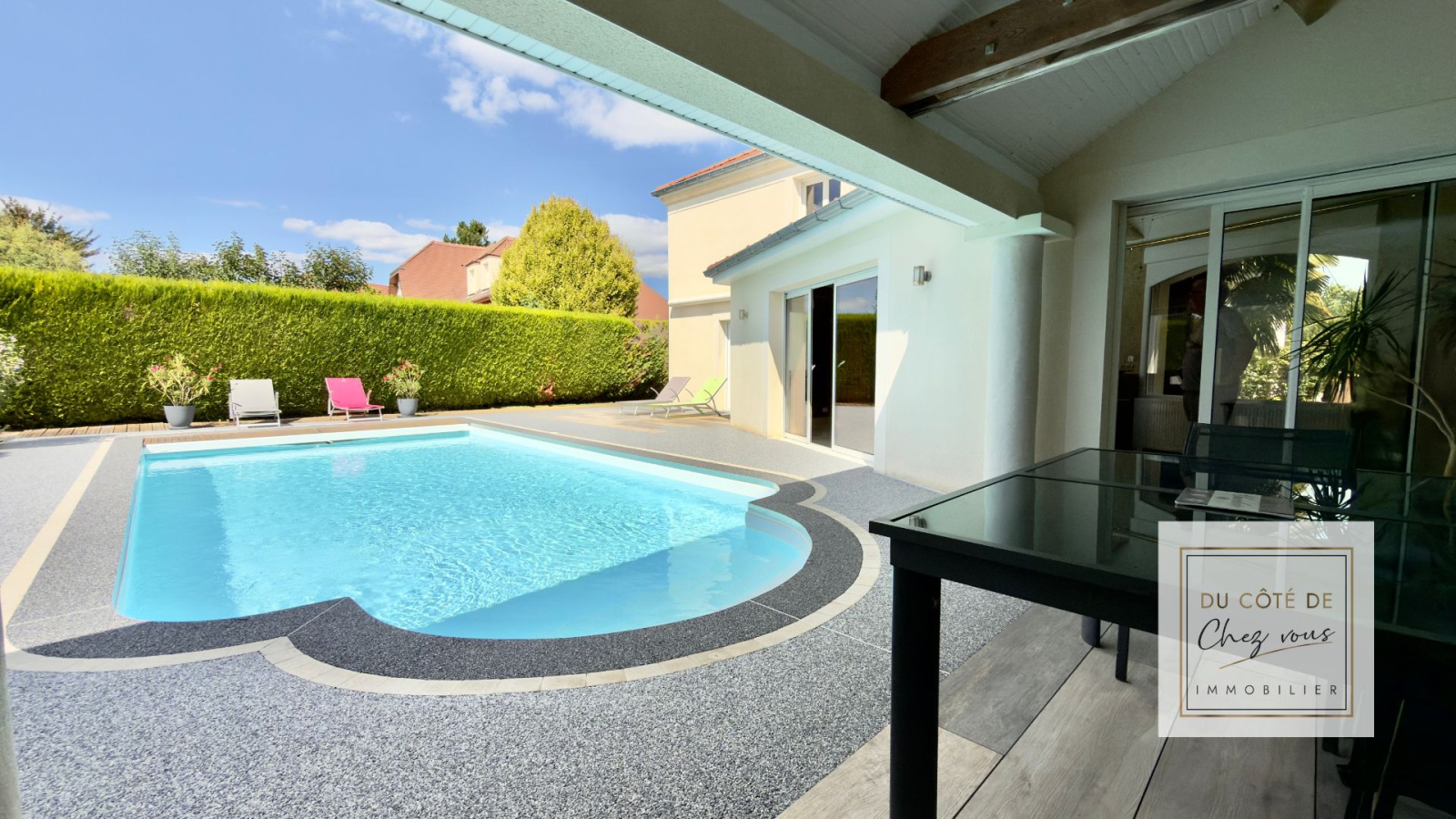 À l’extérieur, les beaux jours prennent une autre dimension : terrasse, terrasse couverte, piscine élégante… Imaginez les soirées d’été, les repas prolongés, les enfants qui jouent pendant que les adultes profitent du calme du quartier.