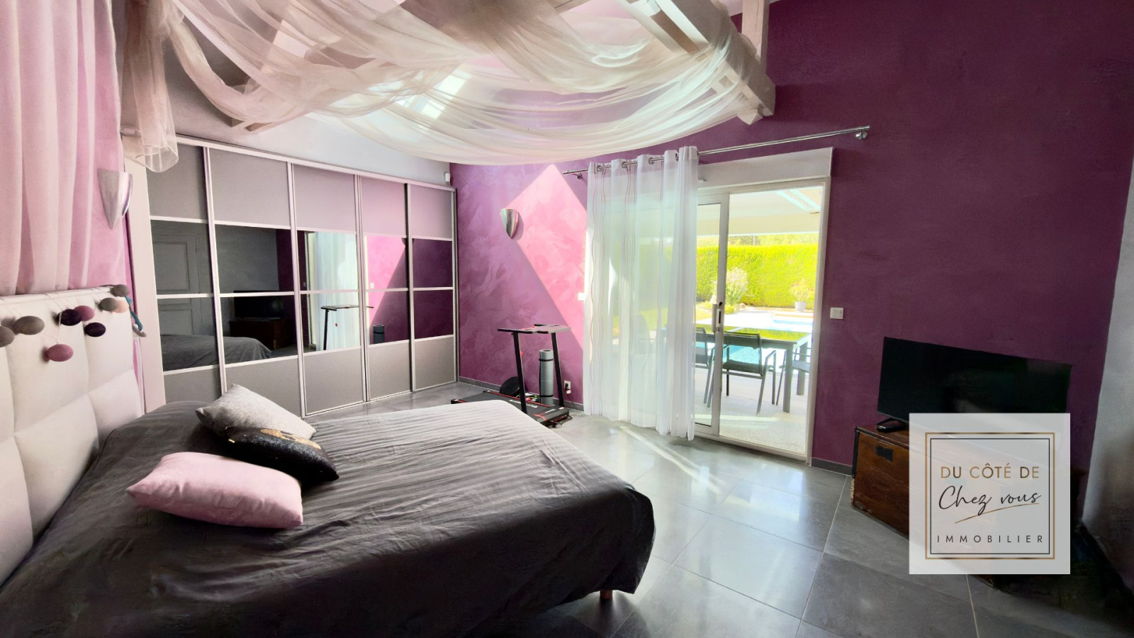 La suite parentale en rez-de-chaussée, avec son accès direct à la terrasse et à la piscine, crée un véritable espace privé, presque comme une parenthèse au sein de la maison.