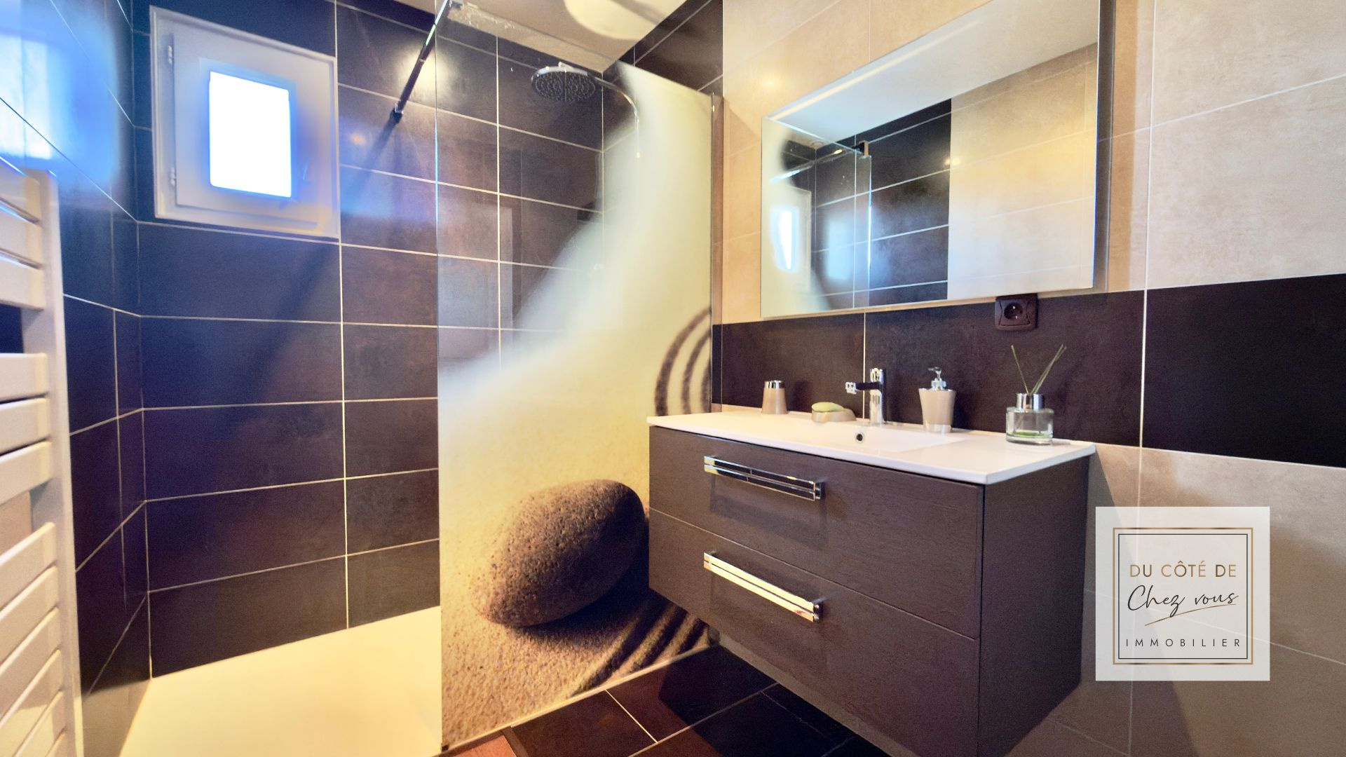 À l’étage, trois chambres confortables permettent à chacun de trouver sa place. L’une dispose de sa propre salle de bains, tandis qu’une salle d’eau indépendante complète l’ensemble. Chacun son espace, chacun son rythme.