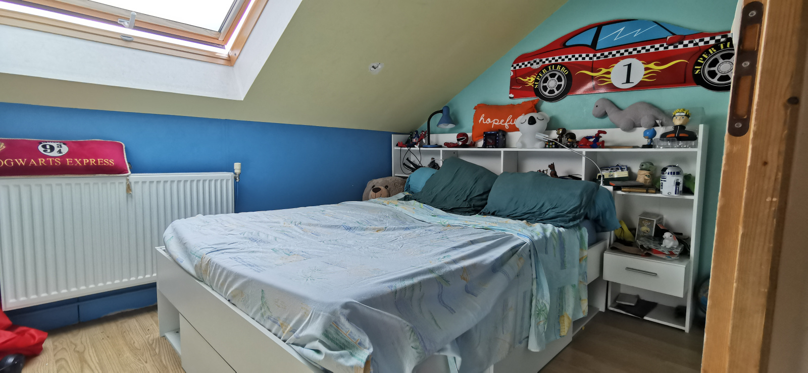 À l’étage, le palier mène à deux chambres ainsi qu’à deux pièces supplémentaires, modulables selon vos besoins : chambres d’appoint, bureaux ou salle de jeux. Un second WC est déjà installé, et l’aménagement d’une salle d’eau supplémentaire est tout à fait envisageable.