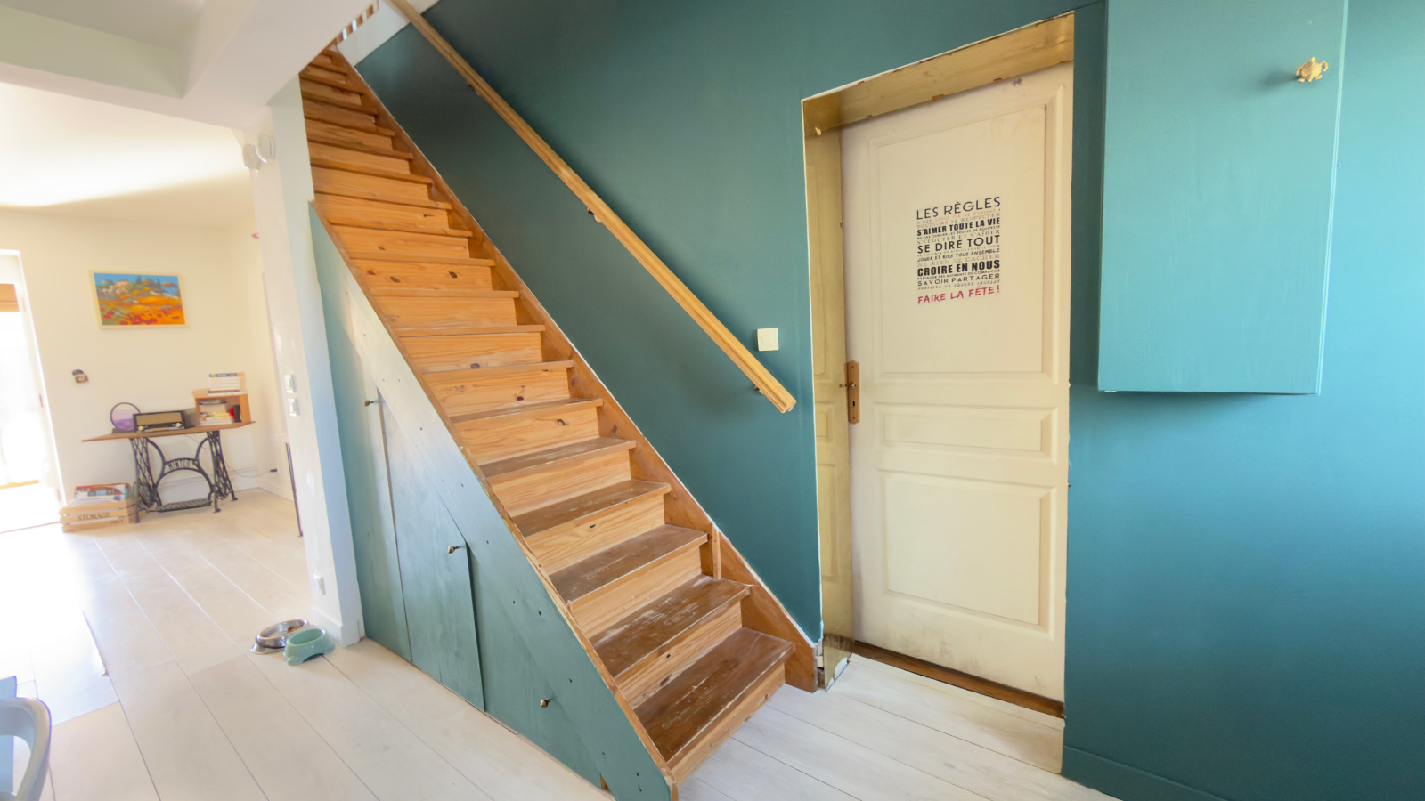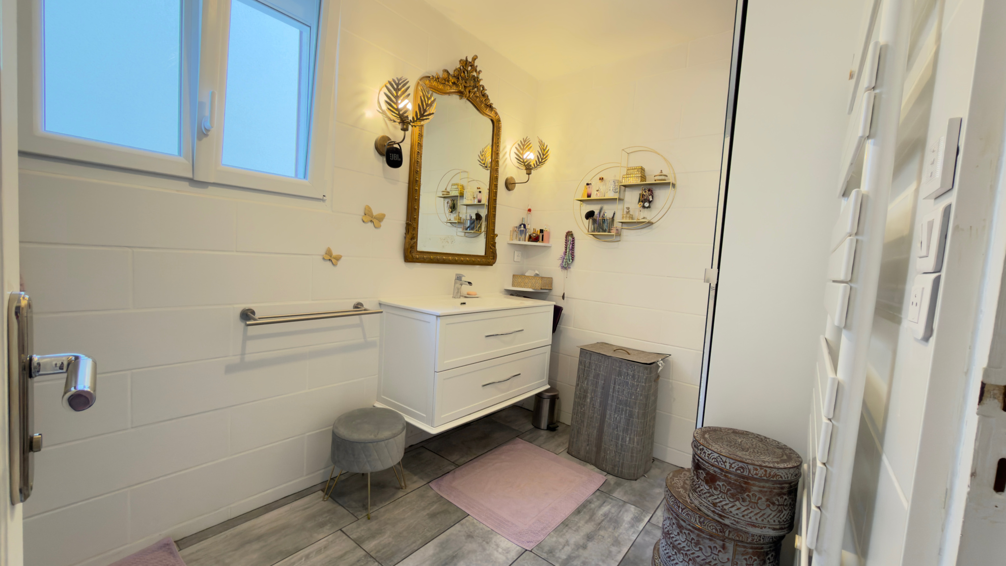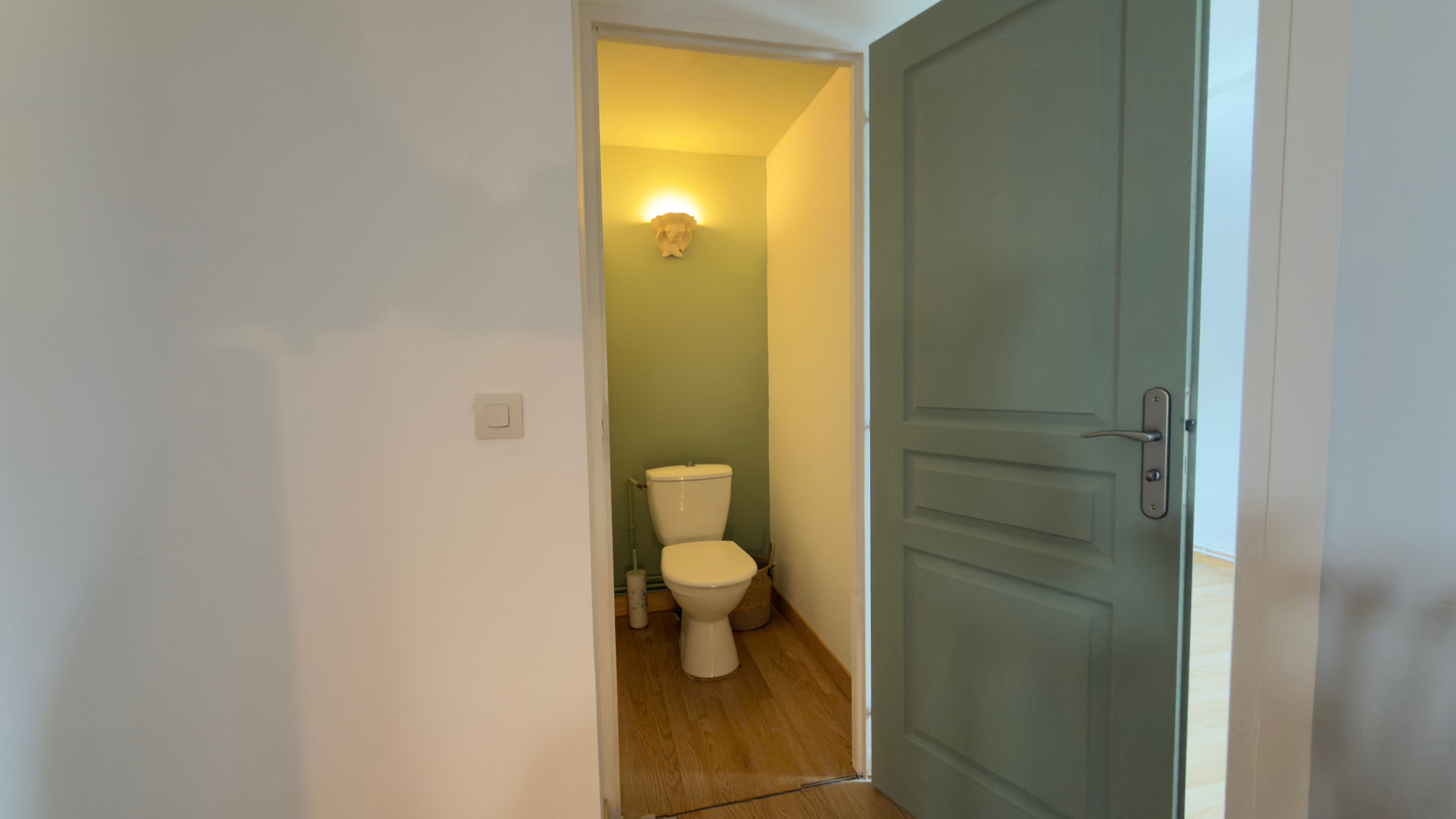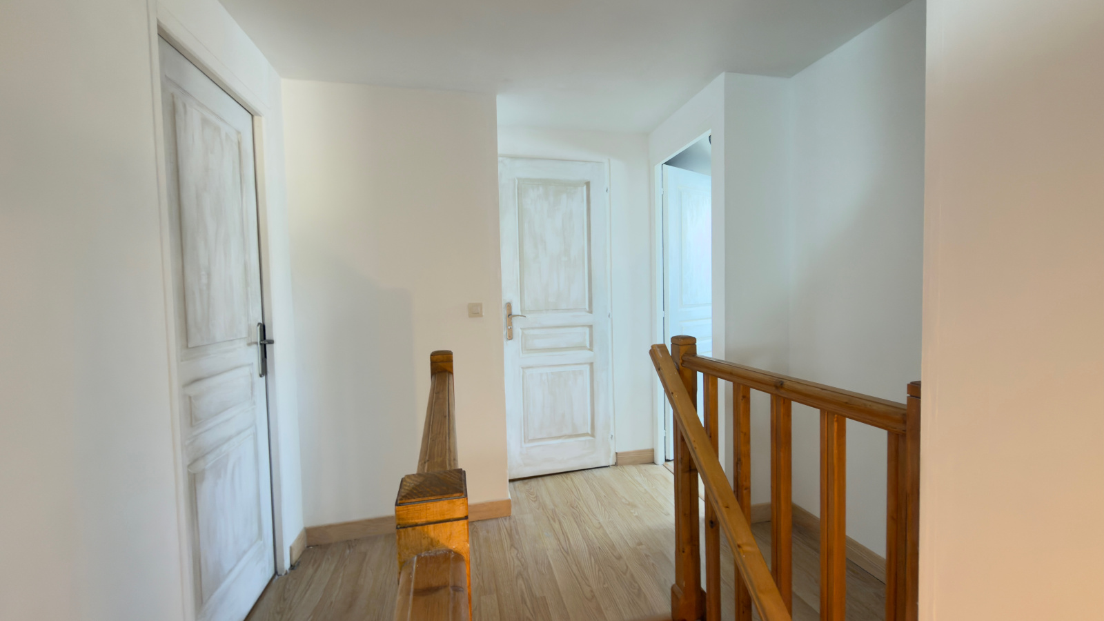 À l’étage, le palier mène à deux chambres ainsi qu’à deux pièces supplémentaires, modulables selon vos besoins : chambres d’appoint, bureaux ou salle de jeux. Un second WC est déjà installé, et l’aménagement d’une salle d’eau supplémentaire est tout à fait envisageable.