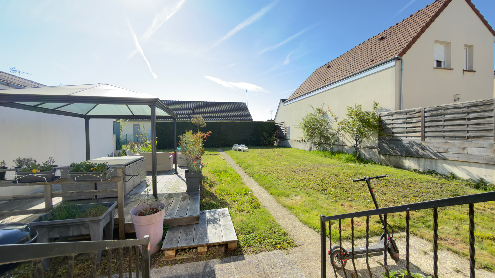 À l’extérieur, le jardin clos et joliment arboré s’étend sur 674 m². Il offre un bel espace de détente avec une terrasse en bois, idéale pour profiter des beaux jours.